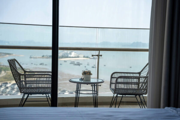 - Phòng khách: Không gian đẹp, hiện đại, với ban công lớn lý tưởng để thưởng thức bữa ăn ngoài trời, nhâm nhi cà phê sáng, hoặc thư giãn ngắm cảnh biển Hạ Long từ tầng 29.
