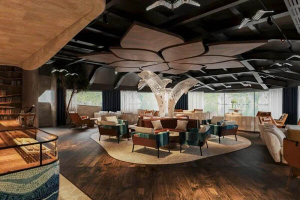 Khu lounge sang trọng với ánh sáng vàng ấm.